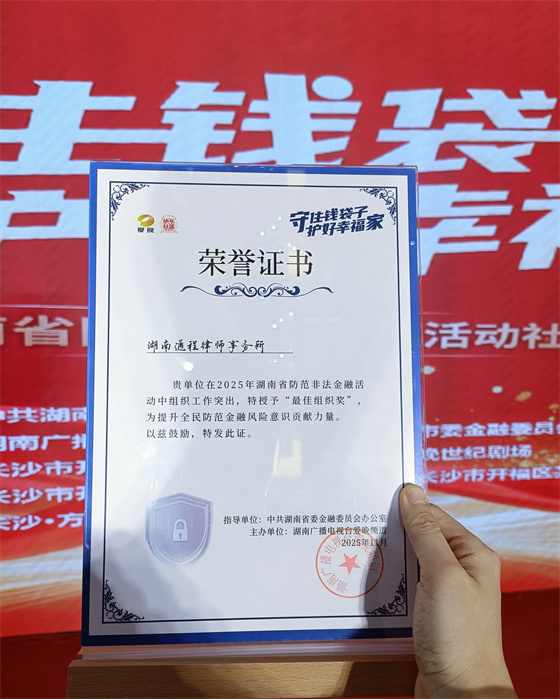 此次获奖是对通程律所两年来防非普法工作的充分肯定。未来,律所将继续秉持初心,深化“法律+社区”服务模式,创新宣传载体与形式,持续开展常态化防非普法活动,为提升群众金融安全意识、构建平安湖南法治环境注入持久法律力量。