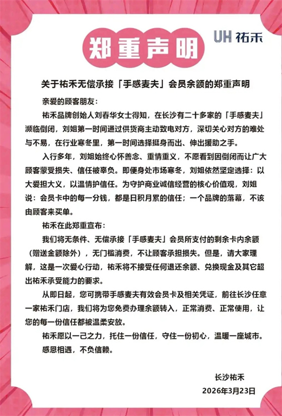 2026年3月23日,烘焙品牌祐禾发布官方声明,宣布无条件、无偿承接长沙本土烘焙品牌手感麦夫会员的实付卡内余额(赠送金额除外),允许会员无门槛消费,避免消费者承担损失。据悉,手感麦夫在长沙拥有二十余家门店,此前因经营失误陷入暂停运营的困境,涉会员储值余额近八百万元,祐禾的承接举措一经发布便在社交平台刷屏,既收获了消费者的关注,也引发了关于行为性质、法律责任、兑付风险的多方热议。