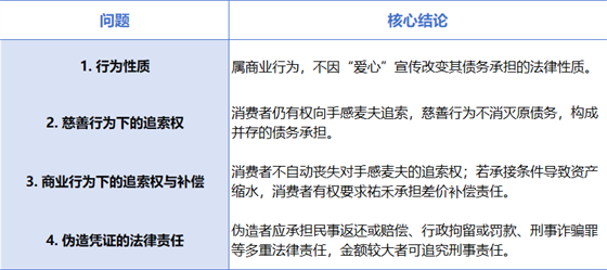 二、若该行为被认定为慈善行为,消费者继续向手感麦夫主张债务及法律责任是否具有法律依据?