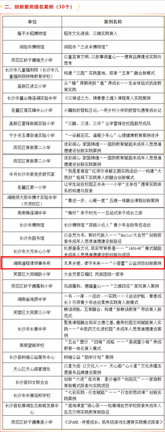 日前,2025年度长沙市未成年人思想道德建设创新案例征集评选结果正式揭晓。经过严格的初审、现场展示与专家评审,湖南通程律师事务所“帮扶服刑人员子女——‘小蓓蕾’公益项目”从全市报送的 211个案例中脱颖而出,成功获评“2025年度创新案例提名”(全市仅30个)